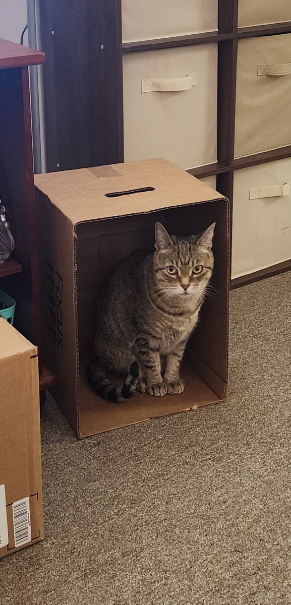 I have been trying to get a picture of sweet Missy for a while now; she is always in the closet or on Toletia’s lap. But I got a good picture today, I saw her on her turbo scratcher, and I had Toletia take her picture with my phone. Toletia’s chair is right next to Missy’s turbo scratcher.